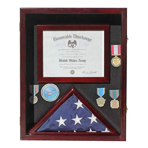Crafted from solid wood. Dimensions: 21.75"H X 17.5"W X 4.25"D (Outside) , Interior Depth: 3.5, Interior of the triangle for the 3'X5' flag folded: 14"W X 7"H X 2.25"D, Interior of the Picture/Certificate frame 8.5"H X 11" W.